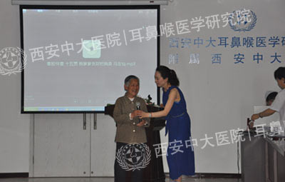 耳鼻喉公益门诊患者代表向西安中大的医护人员表达谢意,在台上发言。