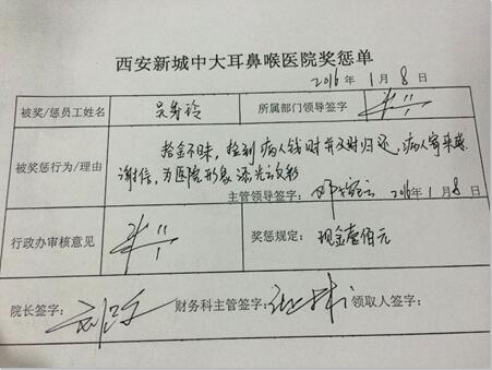 1月8日,西安中大耳鼻喉医院领导对吴秀玲的好人好事拾金不昧之举给予100元的奖励,以示鼓励。
