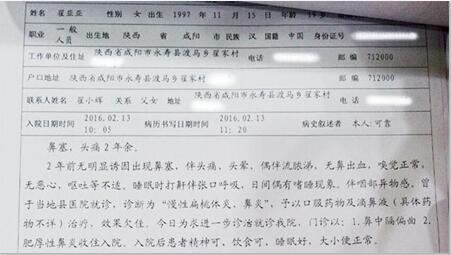 2016年2月13日,小亚东的姐姐翟亚亚因头痛过于厉害,不得已在新年刚过就赶到医院进行检查治疗,被西安中大耳鼻喉医院确诊为鼻中隔偏曲、慢性鼻窦炎,需尽快进行手术治疗。